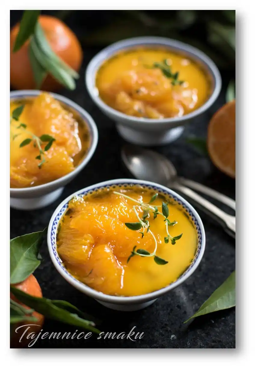- Piankę podawaj z przestudzonymi flambirowanymi pomarańczami i listkami tymianku .
